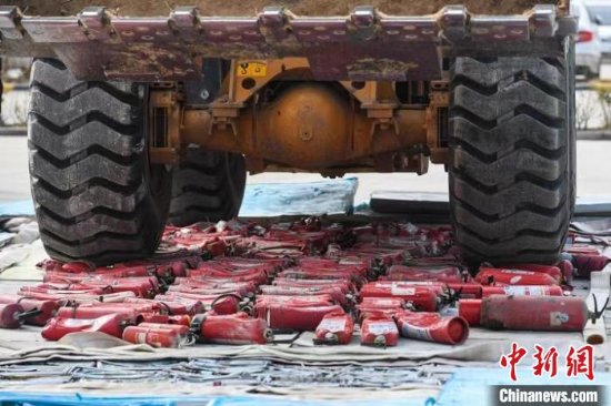 200余件防火门、灭火器、消防水带、感烟探测器等假冒伪劣消防产品被销毁。 武俊杰 摄