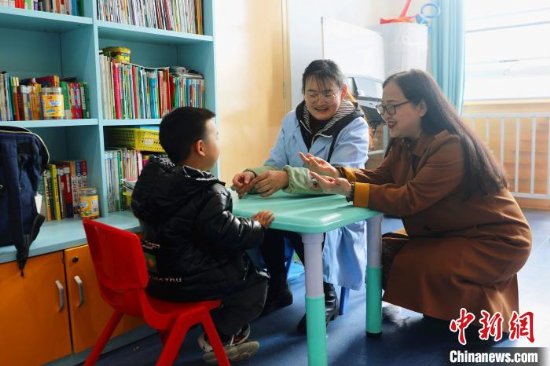 冉存英和老师一起对孤独症孩子进行康复训练 伍轩 摄