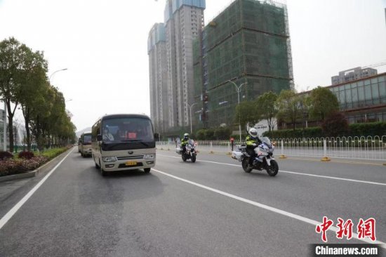 在汉警铁骑的护送下,21日上午,来自天津、江苏、湖南、河南、陕西五省市的100余名援鄂中医国家队代表乘坐大巴重返武汉江夏方舱医院,和曾经的“战友”们相聚。