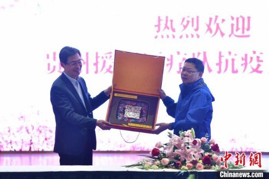 25日晚,在鄂州举行的贵州援鄂医疗队代表团见面会上,贵州省援鄂医疗队代表团团长、贵州省医疗保障局党组书记、局长吕劲松向鄂州市委常委、市委秘书长麻琦转交了这份礼物。
