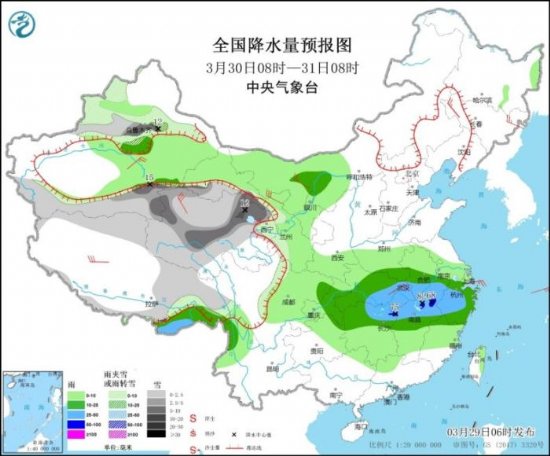 3月29日08时至30日08时,新疆北部、内蒙古东北部、黑龙江西北部、西藏北部、青海西部等地部分地区有小到中雪或雨夹雪,其中,黑龙江西北部、新疆沿天山地区和伊犁河谷等地部分地区有大到暴雪(10~12毫米)。江淮南部、江汉东部、江南北部等地部分地区有中到大雨,其中,江西北部、浙江中南部等地部分地区有暴雨(50~72毫米)。新疆东部、内蒙古中部、吉林东部、甘肃河西、黄淮西部等地部分地区有4~6级风。