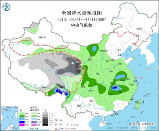 3月31日08时至4月1日08时,西藏东部、西北地区中部、甘肃中南部等地部分地区有小到中雪或雨夹雪,其中,西藏东北部、青海东部、甘肃西南部等地部分地区有大到暴雪(10~17毫米)。内蒙古西部、西藏东南部、甘肃南部、宁夏北部、江淮西部、江汉东部、江南北部、江西中部、西南地区东北部等地部分地区有中到大雨,其中,西藏东南部、湖北东部等地部分地区有暴雨(50~70毫米)。青海西部、宁夏北部等地部分地区有4~6级风。