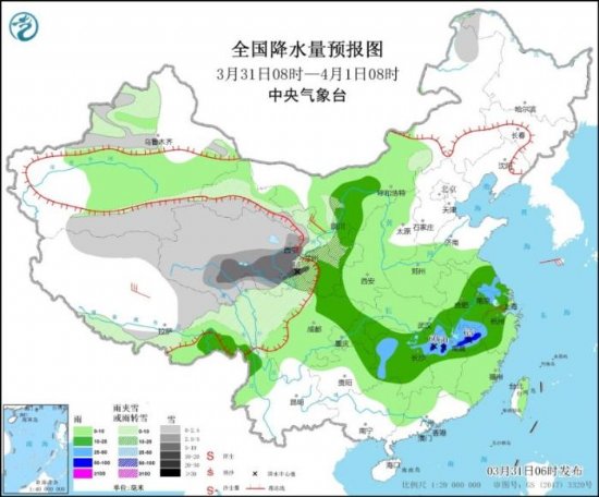 3月31日08时至4月1日08时,新疆北疆西部和南疆南部、西藏北部、西北地区中部、甘肃南部等地部分地区有小到中雪或雨夹雪,局地有大到暴雪(10~11毫米)。内蒙古中西部、西藏东南部、西北地区东南部、江淮大部、江汉东部、江南北部和西部、西南地区东北部等地部分地区有中到大雨,其中,江西北部、浙江西南部等地部分地区局地有暴雨(50~65毫米)。内蒙古西北部、西藏中部、浙江北部等地部分地区有4~6级风。