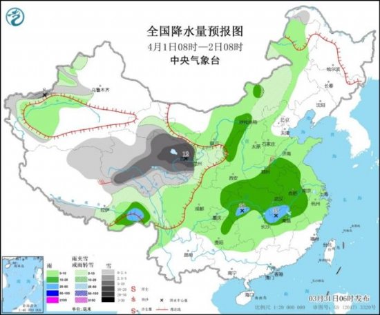 4月1日08时至2日08时,新疆西部、西北地区中部、甘肃中部、宁夏中南部、西藏东部、内蒙古东部等地部分地区有小到中雪或雨夹雪,局地有大到暴雪(10~12毫米)。内蒙古西部、新疆南疆盆地、西藏东南部、西北地区东部、华北大部、黄淮、江淮、江汉、江南大部、西南地区大部等地部分地区有小到中雨,局地有大雨(25~35毫米)。黄淮西部、西藏北部等地部分地区有4~6级风。