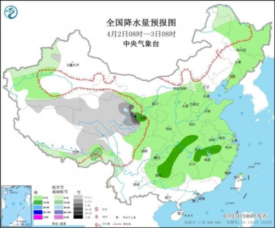 全国降水量预报图(4月2日08时-3日08时)