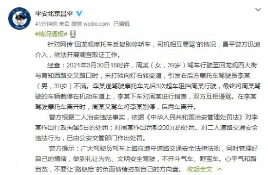 回龙观摩托反复别停轿车司机相互辱骂 昌平警方:均已处罚