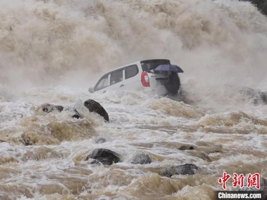 杨林桥派出所所长谭楚立即带领8人携救生设备赶到现场,只见一辆白色车辆在离岸边五六米的地方被一块巨石卡住,一男子打着伞蹲在翘起的车尾处,咆哮的河水将人和车包围,并不断冲击车体。