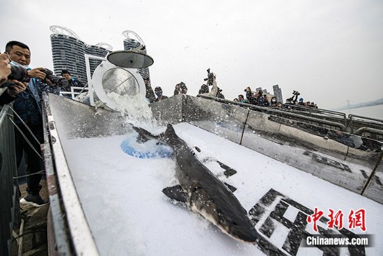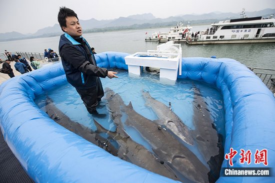 4月10日,一万尾中华鲟从湖北省宜昌市长江珍稀鱼类放流点踏上“回家”旅程,十数天以后,这些佩戴“身份证”的中华鲟将洄游入海。中新社发 景卫东 摄