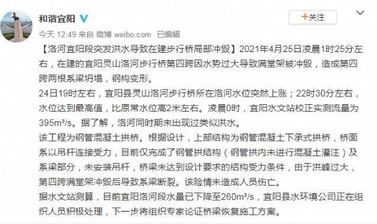 据河南省洛阳市宜阳县官方微博消息,4月25日凌晨1时25分左右,在建的宜阳灵山洛河步行桥第四跨因水势过大导致满堂架被冲毁,造成第四跨两根系梁坍塌,钢构变形。