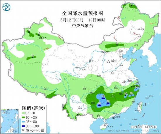 图1 全国降水量预报图(5月12日8时-13日8时)