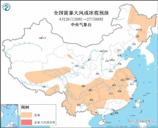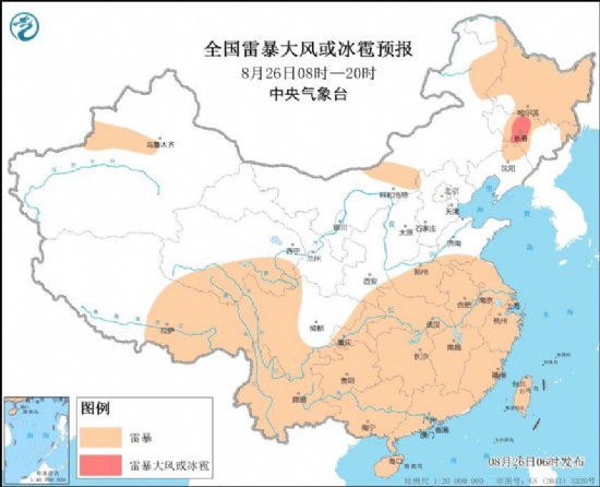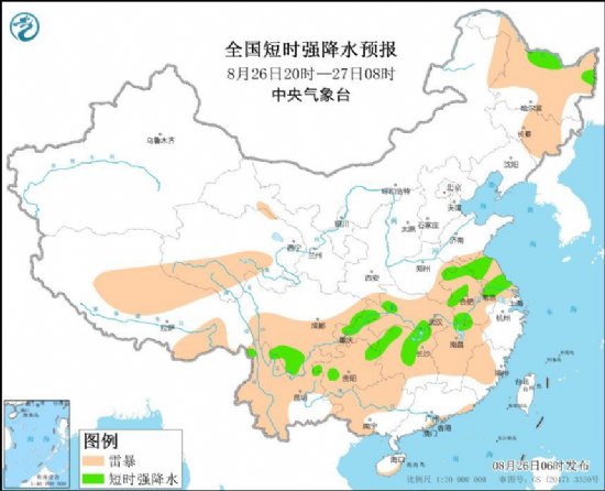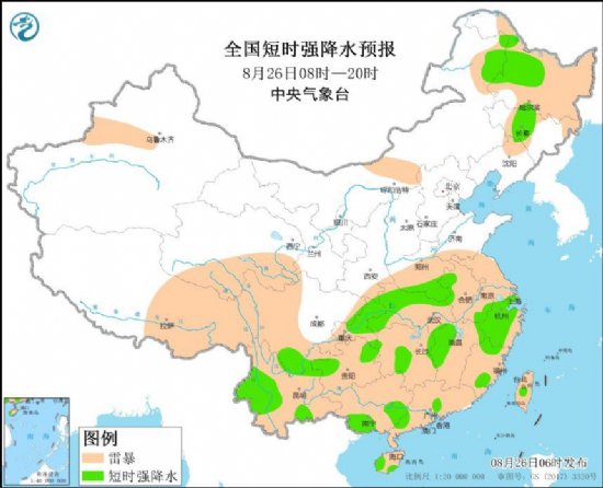 据中央气象台网站消息,预计8月26日08时至27日08时,内蒙古东北部、黑龙江西部和北部、吉林中部、河南南部、安徽、江苏、湖北、湖南中部和北部、江西北部、浙江、福建北部和南部、四川南部、重庆、贵州北部、云南西部、广西南部、广东南部等地的部分地区将有短时强降水天气,小时雨量20-50毫米,局地可达60毫米以上;另外,吉林中部局地将有雷暴大风或冰雹天气。