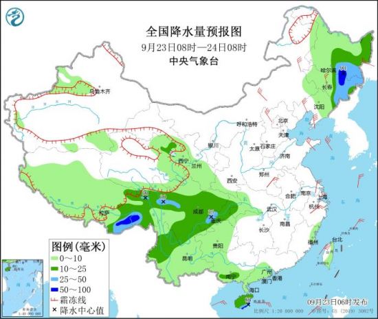 全国降水量预报图(9月23日08时-24日08时)