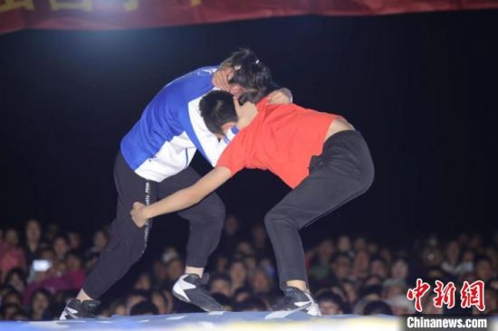 在“二羊赛”中,打头阵的是当晚参赛年龄最小的曲妹妹,她仅有5岁,小女生独自站上跤场,等待对手上台挑战的时间里,毫不怯场。最终,哥哥上场,兄妹打擂,一招一式颇有章法,妹妹虽然落败,但她不服输的精气神儿为她赢得了高回报——有观众现场赞助2000元为她加油。