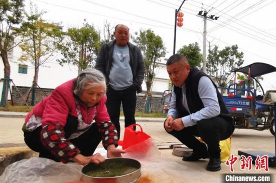 蹲在新家门口,姚柏松的妻子筛着中草药。 赖家权 摄