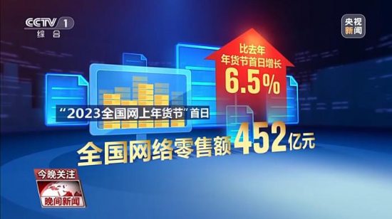 商务大数据监测显示:“2023全国网上年货节”首日,全国网络零售额452亿元,比去年年货节首日增长了6.5%,新年装饰品、葡萄酒、年夜饭预制菜等品类热销,销售额同比分别增长118.0%、90.7%和69.6%。(央视新闻客户端)