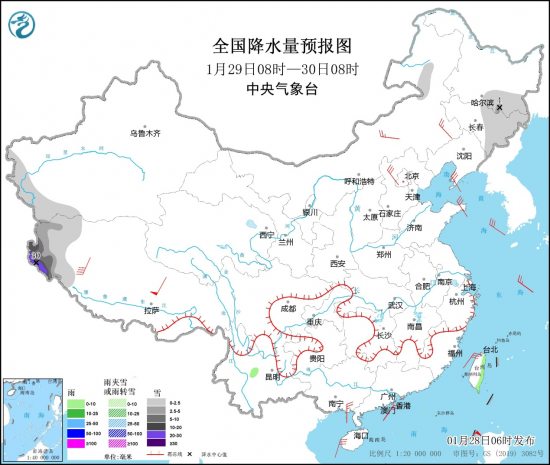 全国降水量预报图(1月29日08时-30日08时)。图片来源:中央气象台网站