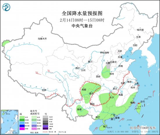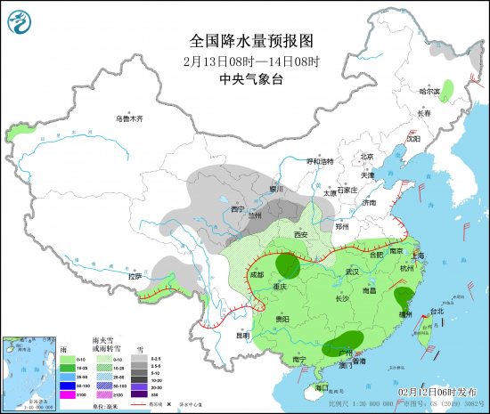 全国降水量预报图(2月13日08时-14日08时)。图片来源:中央气象台网站