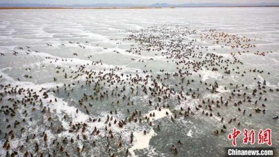 图为乌梁素海冰面上密密麻麻的候鸟。 王泽浩 摄