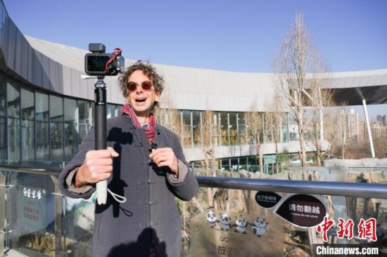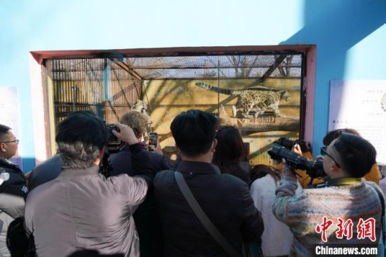 图为中外文旅达人在豹馆前拍摄雪豹。马铭言 摄