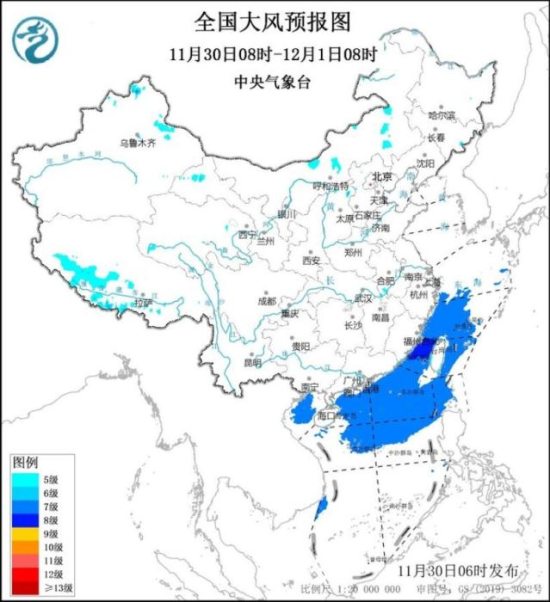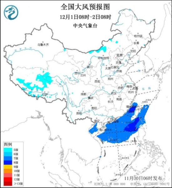 11月30日08时至12月1日08时,新疆北部、西藏南部、内蒙古中东部及我国东南沿海地区将有5~6级、阵风7~9级的大风;东海南部海域、台湾海峡、台湾以东洋面、巴士海峡、南海北部和中部海域、北部湾将有7~8级,阵风9级的大风。12月1日08时至12月2日08时,西藏中西部、青海西南部、内蒙古中部及我国东南沿海地区将有5~6级、阵风7~9级的大风;东海西南部海域、台湾海峡、台湾以东洋面、巴士海峡、南海北部和中部海域、北部湾将有7~8级、阵风9级的大风。中央气象台11月30日06时继续发布大风蓝色预警。