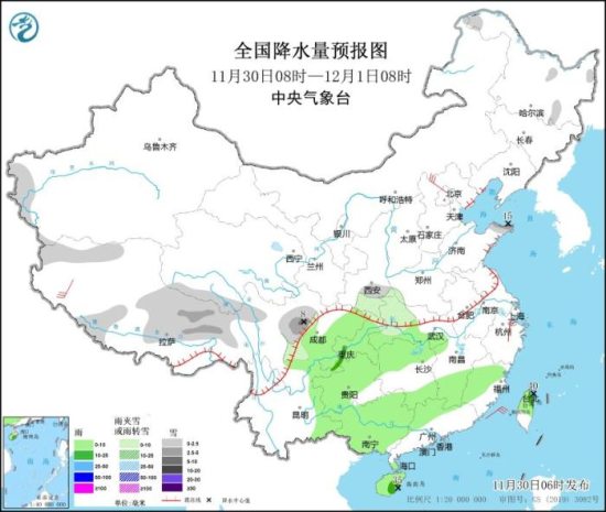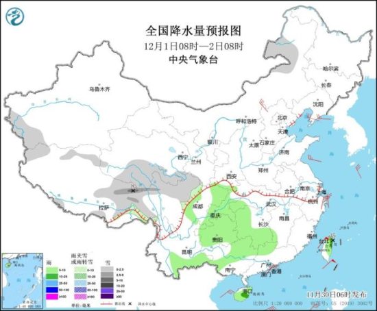 全国降水量预报图(11月30日08时-12月1日08时)