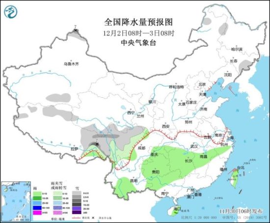 全国降水量预报图(12月2日08时-3日08时)中新网11月30日电