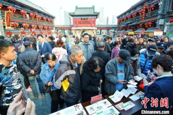 3月11日,天津古文化街戏楼广场,市民游客排队购买主题邮资机戳纪念封、明信片。佟郁 摄