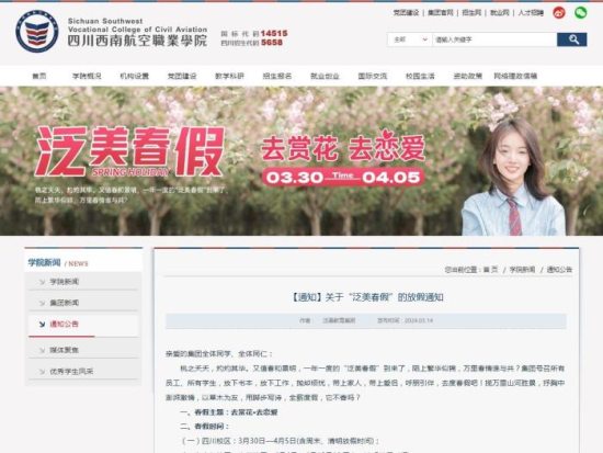 四川西南航空职业学院3月14日发布《关于“泛美春假”的放假通知》,该通知安排全校师生3月30日至4月5日放7天春假(含清明放假时间),并号召所有员工、所有学生,放下书本,放下工作,带上家人,带上爱侣,呼朋引伴,去度春假。