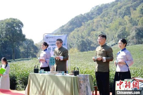 20日,杭州西湖龙井茶在春分之际正式开采。杭州“百姓茶馆”湖畔居西湖龙井茶基地开茶节现场茶香四溢,今年的采茶季拉开大幕。