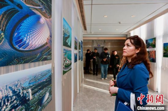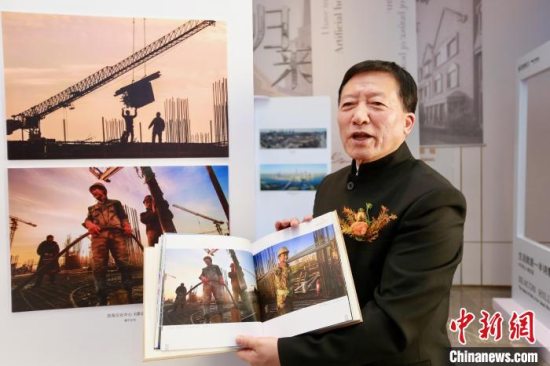 记者在现场看到,展出的作品名称多以“建设、崛起”命名,如作品《滨海崛起》《中新天津生态城的崛起》《热火朝天的建设工地》《天津滨海新区文化中心工程建设者-百名工人形象图》等,通过对同一地标建筑的同一位置、同一场景下的客观记录,准确地展示出社会的发展变迁和人文关怀。