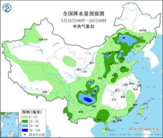 预计未来三天,西北地区东部、内蒙古中东部、华北大部、东北地区南部以及黄淮北部等地将迎来一次明显降雨天气过程,部分地区雨量可达中到大雨,局地或伴有雷暴大风、冰雹等强对流天气;今明两天,广东东部沿海、福建南部沿海、海南岛等局地有暴雨,部分地区伴有短时强降水(最大小时降雨量20~40毫米,局地可超过50毫米)。另外,25日夜间起,四川盆地、江南、华南等地将有新一轮强降雨过程。