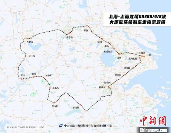 新图中,通过列车区段调整和延伸,安排开行上海-上海虹桥、上海虹桥(上海)~安庆、上海虹桥(上海)~黄山北、上海虹桥(上海)~黄山西、上海-合肥南等管内方向高铁列车4对;其中,首次尝试开行上海-上海虹桥G8388/9/8次大环形高铁列车1列,再次将上海、南京、合肥、杭州等4座长三角中心、副中心城市串联,单向行驶里程超过1200公里,沿途连接黄山、九华山、千岛湖等多个风景名胜区,全程停靠长三角三省一市共19座车站(不含始发终到站),通过与上海-合肥南G7357/6次和合肥南-上海虹桥G7174/1次高铁列车互补开行,为沿线旅客往返出行提供便利。