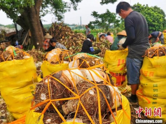 7月26日,广东台山市四九镇望岗村,种植户组织工人在分拣、打包芋头。李晓春 摄
