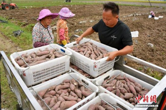 近日,广东台山市,北陡镇的农户将刚采挖到的番薯装车。陈泽群 摄