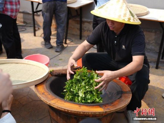 图为炒茶师傅指导游客体验手工炒茶。严敏玉 摄