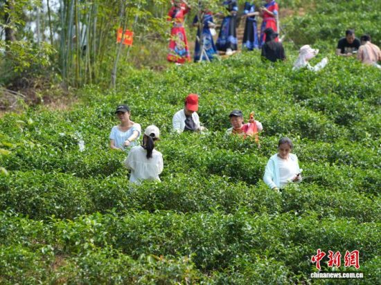 图为游客们上山采摘春茶。严敏玉 摄
