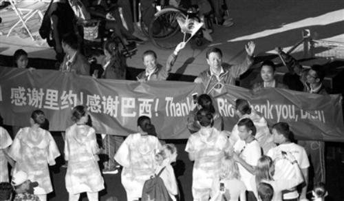 中国代表团手持感谢巴西的横幅入场 新华社发